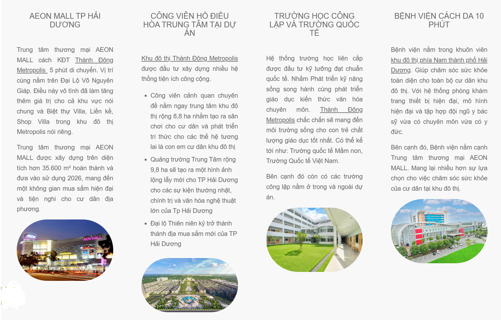 KĐT Metroplis Thành Đông chất sống sang vượt mọi chuẩn mực, không gian sống hoàn hảo bậc nhất Hải Dương. Dự án khu đô thị Metropolis Thành Đông cửa ngõ phía Nam Thành Phố là nơi hội tụ của những chủ nhân danh giá với trọn vẹn hệ sinh thái xanh riêng biệt và những tiện ích đa dạng, tuyệt vời của toàn khu: Quảng trường; đại lộ trung tâm THIÊN NIÊN KÝ, Bệnh viên quốc tế, trung tâm thương mại Aeon Mall, công viên hồ điều hòa chuyên đề 8.8ha, trường cấp 1,2,3 công lập; quốc tế, khu shop villa,…